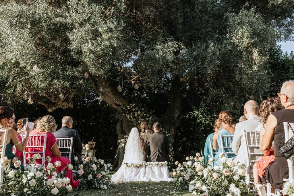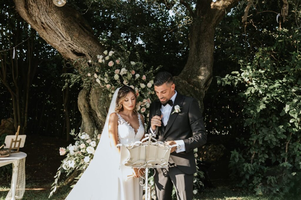 Quando Mary raggiunge Francesco è pura magia. Tra profumi delicati, ulivi secolari e gli sguardi commossi di famiglia e amici, inizia la cerimonia, che sugellerà il loro amore per sempre. Dolcemente, Mary e Francesco si cercano con lo sguardo, in segno di amorevole complicità e promessa eternità. L’atmosfera è così delicatamente toccante, che rapisce il cuore degli invitati presenti a celebrare l’amore di Mary e Francesco.