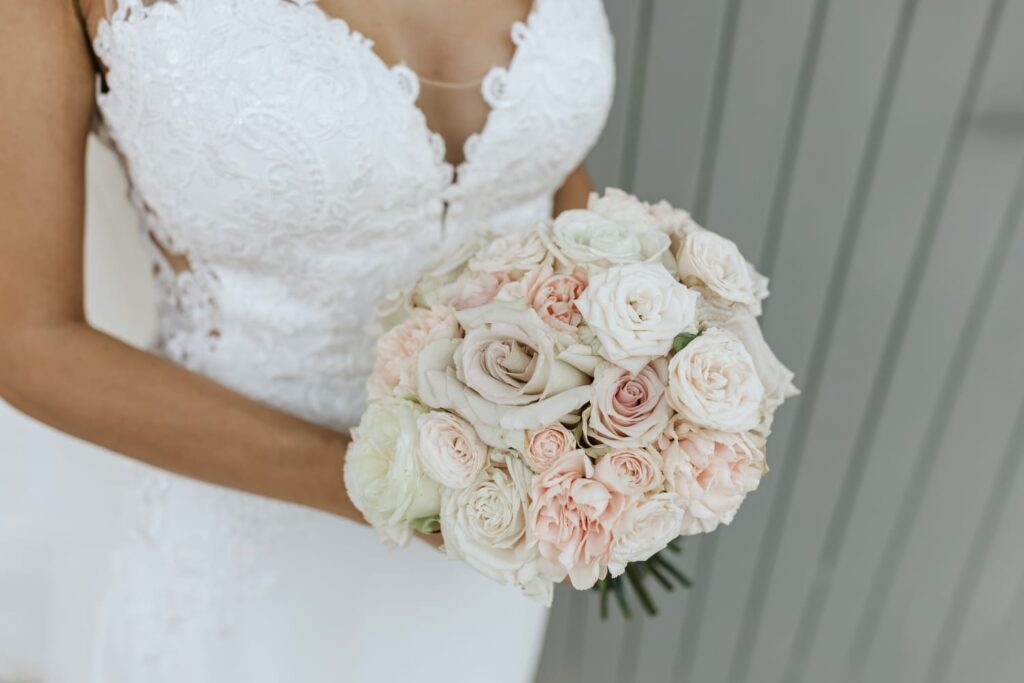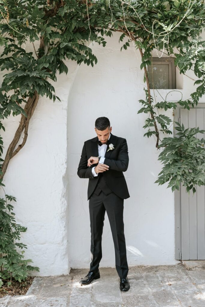 Mary si prepara a fare il suo ingresso, circondata dall’amore delle persone più care. Indossa un elegante abito bianco, che le conferisce un’aria angelica. Il boquet è ispirato alla delicata armonia che decora la masseria.