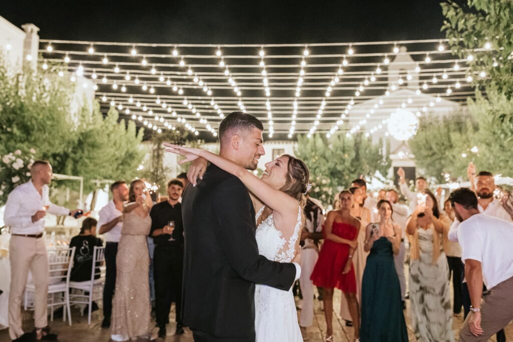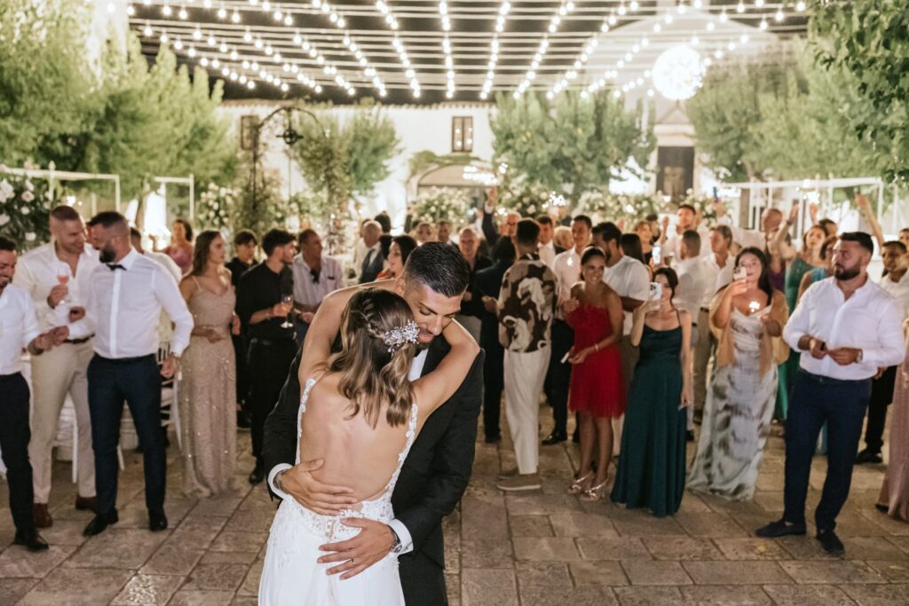 La festa continua fino a sera. Mary e Francesco si stringono per il loro primo ballo, circondati dagli occhi commossi di familiari e amici. Tra una danza e l’altra, arriva il momento della pizzica e della tarantella, balli tradizionali della Puglia.