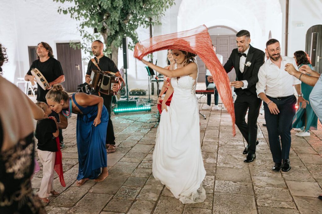 A suon di tamburelli e fisarmonica, Mary danza fascinosa, disegnando movimenti sinuosi con il velo rosso tra le sue mani: una tradizione tutta pugliese, che affonda le sue radici nell’antichità. Anche gli invitati si lasciano trasportare da questa danza travolgente.