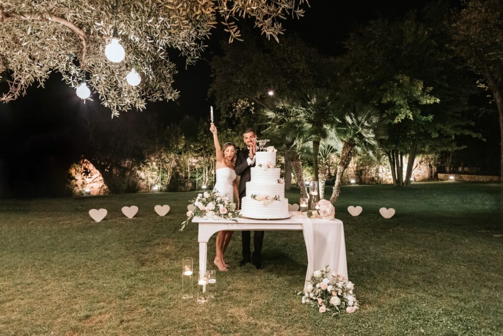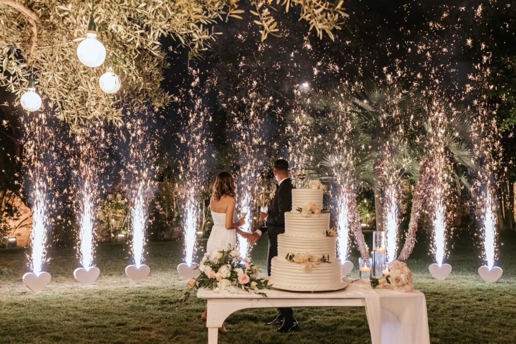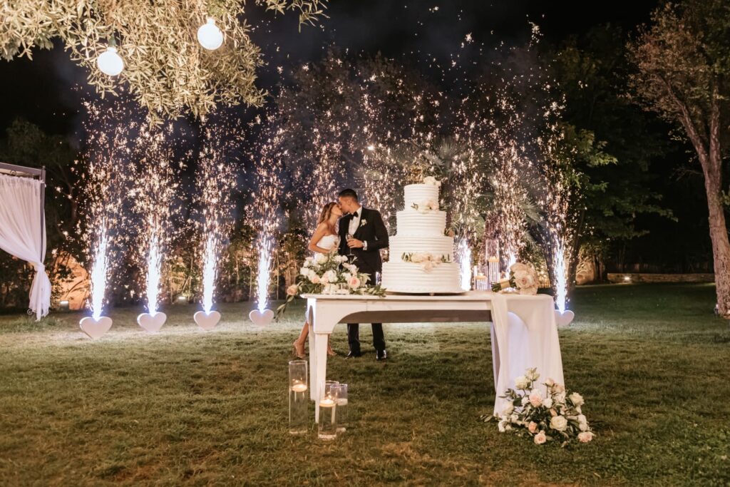 Arriva il momento della torta nuziale e Masseria Montalbano si illumina di fontane luminosissime. Una scenografia mozzafiato per coronare il grande giorno di Mary e Francesco.
